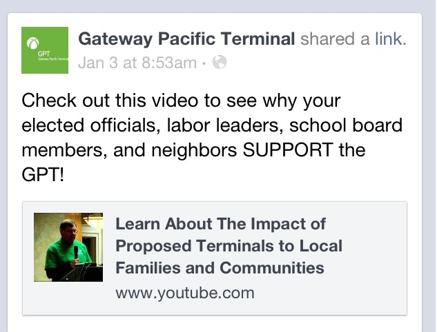 Foulke has allowed photos of himselfvideo, and written statements of his to be used in advertisements to promote the GPT project. An example of one of those, is a video published on YouTube by Gateway Pacific Terminal on Nov 10, 2012, which features Foulke promoting GPT after first introducing himself as a “school board member now in the Ferndale School district.” Excerpts below are taken from that video: