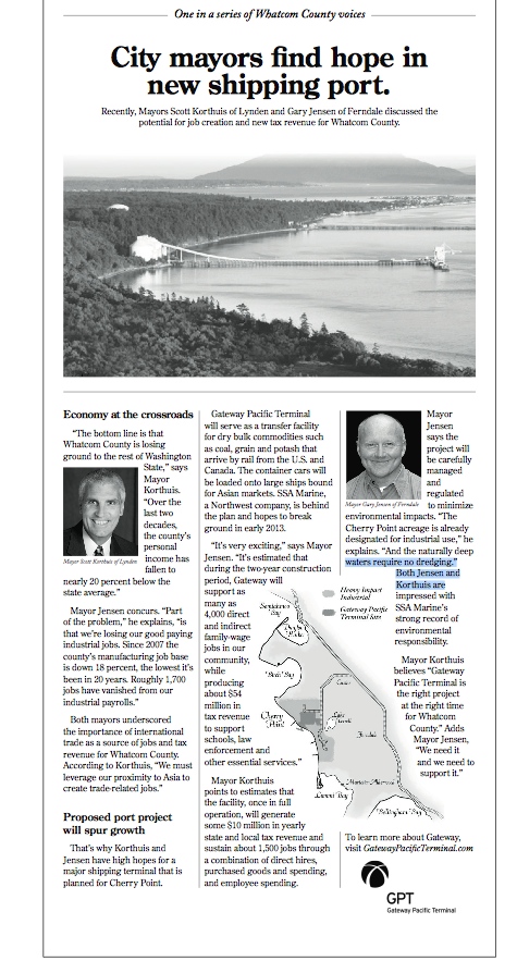 On February 20, 2011, a print advertisement for the GPT project was featured in the Sunday edition of The Bellingham Herald. Gary Jensen, as a sitting mayor, allowed himself to be used in that ad by SSA Marine.