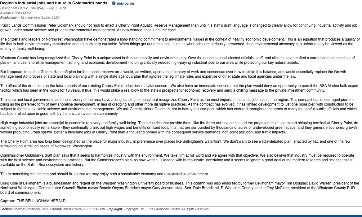 The opinion piece was a pressured public appeal to Washington State’s Public Lands Commissioner Peter Goldmark, asking him to change language in the draft of the Cherry Point Environmental Aquatic Reserve Management Plan. The plan was being updated at that time in 2010 by the DNR, which manages state-owned aquatic lands. The plan had been enacted in 2000 to protect the sensitive and unique aquatic ecosystem at Cherry Point in the Strait of Georgia. The Cherry Point Reserve and its management plan was/is a potential roadblock to SSA Marine for its GPT project proposed at Cherry Point.
