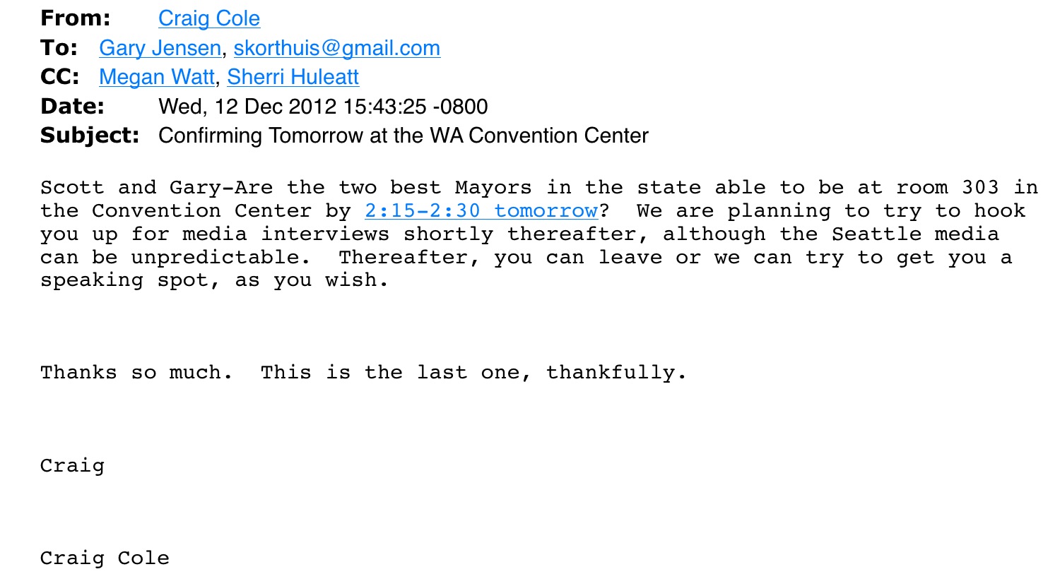 On December 12, 2012, Craig Cole sent an email to Mayor Jensen, asking him if he would travel to the Seattle December 13 EIS scoping hearing for GPT, to speak to the media there, in support of SSA’s GPT project. In his dogged loyalty to SSA Marine, Mayor Jensen traveled to Seattle to address the media, expressing his support for the project. Records also show a December 11, 2012 email sent from Craig Cole to Mayor Jensen, asking him to do a radio interview the next day on December 12th, with conservative talk radio host, John Carlson of Talk Radio 570 KVI, which the mayor agreed to do.