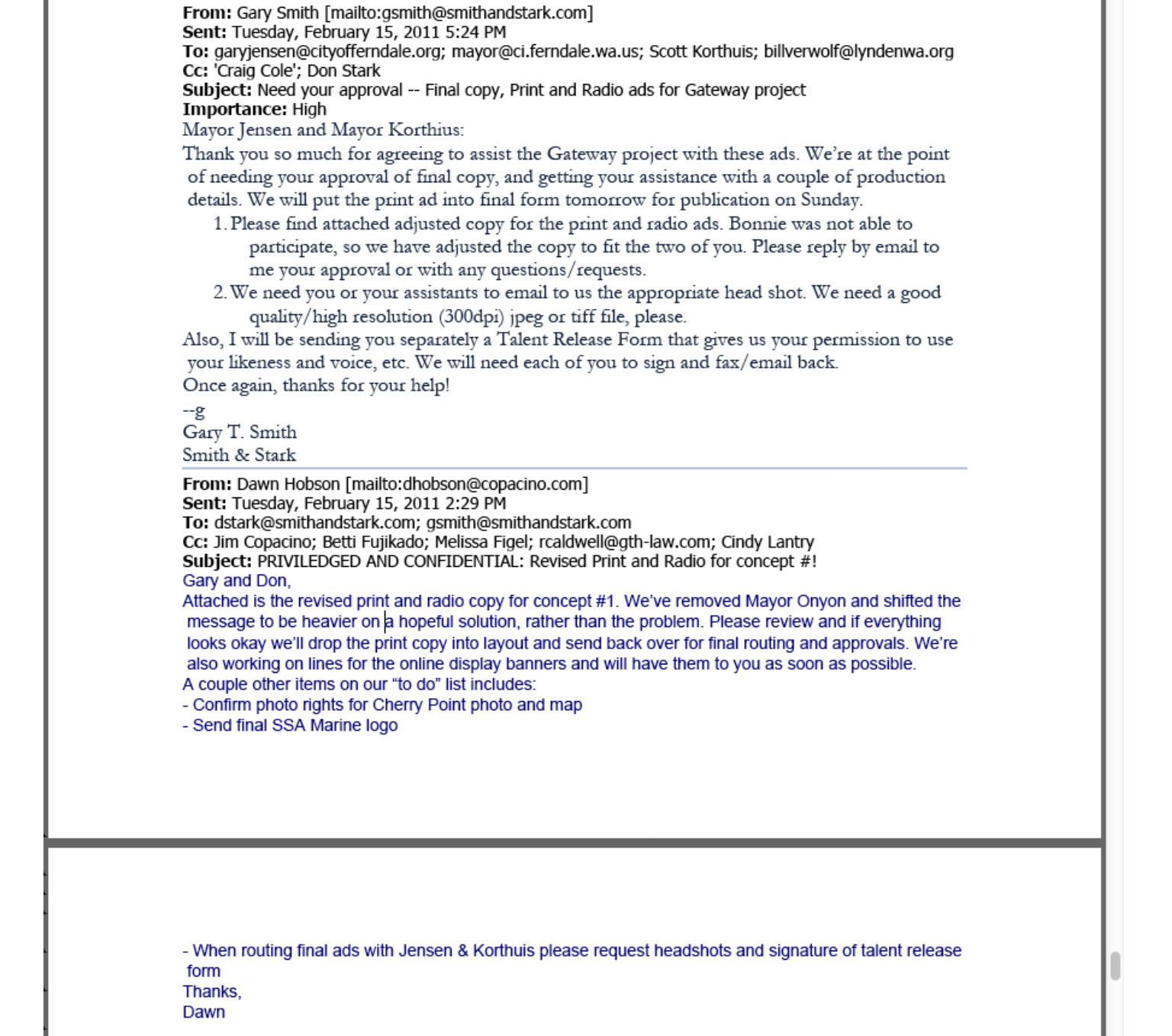 In his February 15 email, Gary Smith asked mayors Jensen and Korthuis for their approval on the final copy for a GPT print ad which he said was slated to run on February 20, 2011, in The Bellingham Herald, and for the mayors’ approval on the final copy for a GPT radio ad which was also slated to run that week.