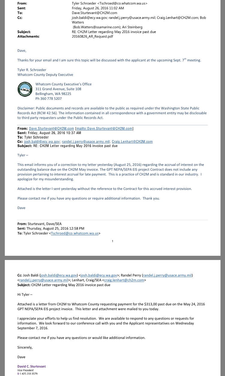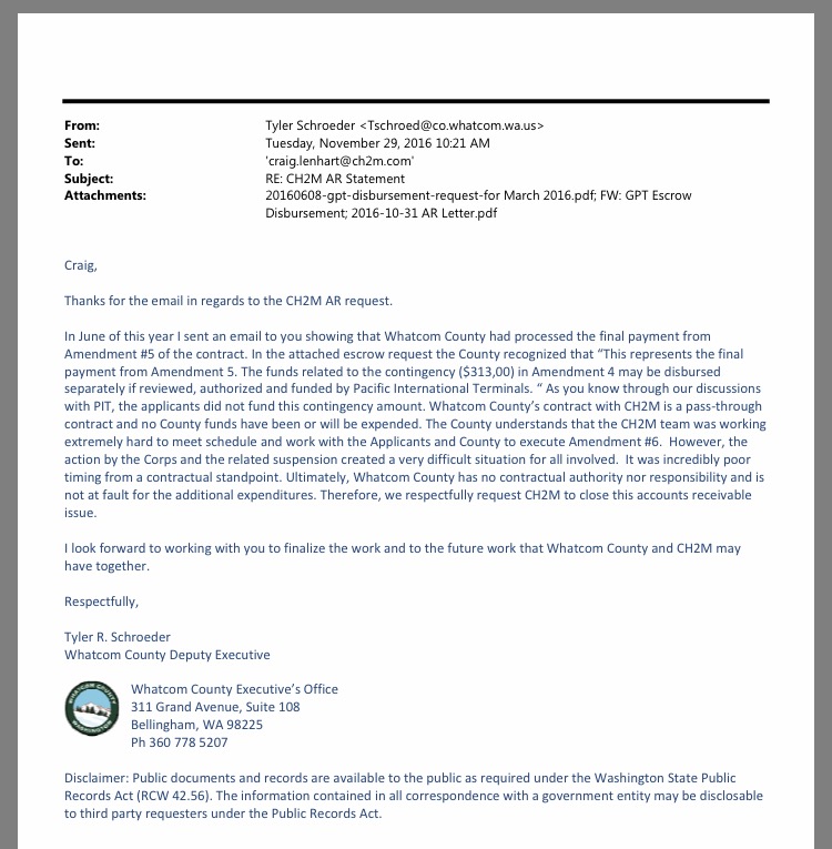 Email records obtained from Whatcom County show that CH2M Hill Vice President Dave Sturtevant, sent an invoice on August 25, 2016, to Whatcom County Executive’s Office (to Deputy Executive Tyler Schroeder’s attention) for what the consultant says is an outstanding balance due of $313,000. Those email records also show a May 3, 2016 email communication chain between PIT/SSA Marine’s Bob Watters, and Schroeder, in which, Watters expressed serious concerns about “cost overruns for the past four months [at that time]” and CH2M Hill’s management of the EIS work process and contract. Watters also requested that Whatcom County require CH2M Hill have an “independent audit of the hours and costs to prepare the EIS to date performed at no cost to Whatcom County or the project proponents.”