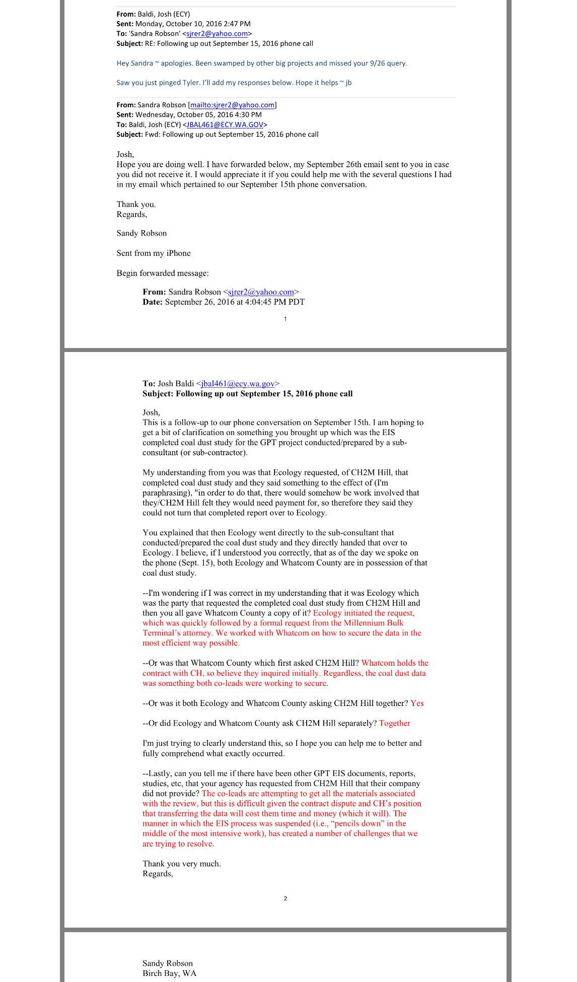 Responding to this writer’s September 26, 2016 email inquiry asking if there have been GPT EIS documents, reports, studies, etc., that its agency had requested from CH2M Hill that the consultant did not provide, EIS co-lead Washington State Department of Ecology’s Regional Director Josh Baldi, explained in an October 10, 2016 email reply that the co-lead agencies were attempting to get all the materials associated with the environmental review, but that it was difficult “given the contract dispute and CH’s [CH2M Hill’s] position that transferring the data will cost them time and money (which it will).” Baldi went on to say in his response that “the manner in which the EIS process was suspended (i.e., ‘pencils down’ in the middle of the most intensive work), created a number of challenges” that the co-leads are trying to resolve.
