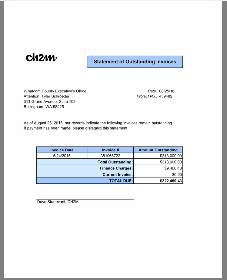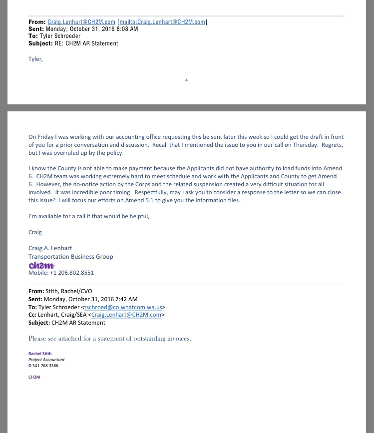 Email records obtained from Whatcom County also show that CH2M Hill Program Manager Craig Lenhart, sent an October 31, 2016 email to Schroeder, which included an invoice letter from CH2M Hill Project Accountant Rachel Stith, for the amount of $313,000, with an invoice date of “5/24/16,” directed to the Whatcom County Executive’s Office, attention Tyler Schroeder.