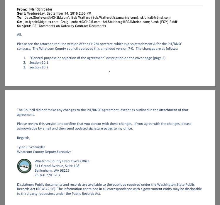 However, Dave Sturtevant, Vice President at CH2M Hill, the company preparing the EIS for the proposed Gateway Pacific Terminal (GPT) project, saw things differently than Executive Louws’ and Deputy Executive Schroeder’s framing of Contract Amendment No. 5.1, during the committee meeting that day. According to email records obtained from Whatcom County, Sturtevant told Schroeder, that based on CH2M Hill’s review of the Council meeting’s audio recording, “it appears that there is a significant misunderstanding by the County regarding the expected deliverables and public access to project information at the conclusion of the Amendment 5.1 work.”