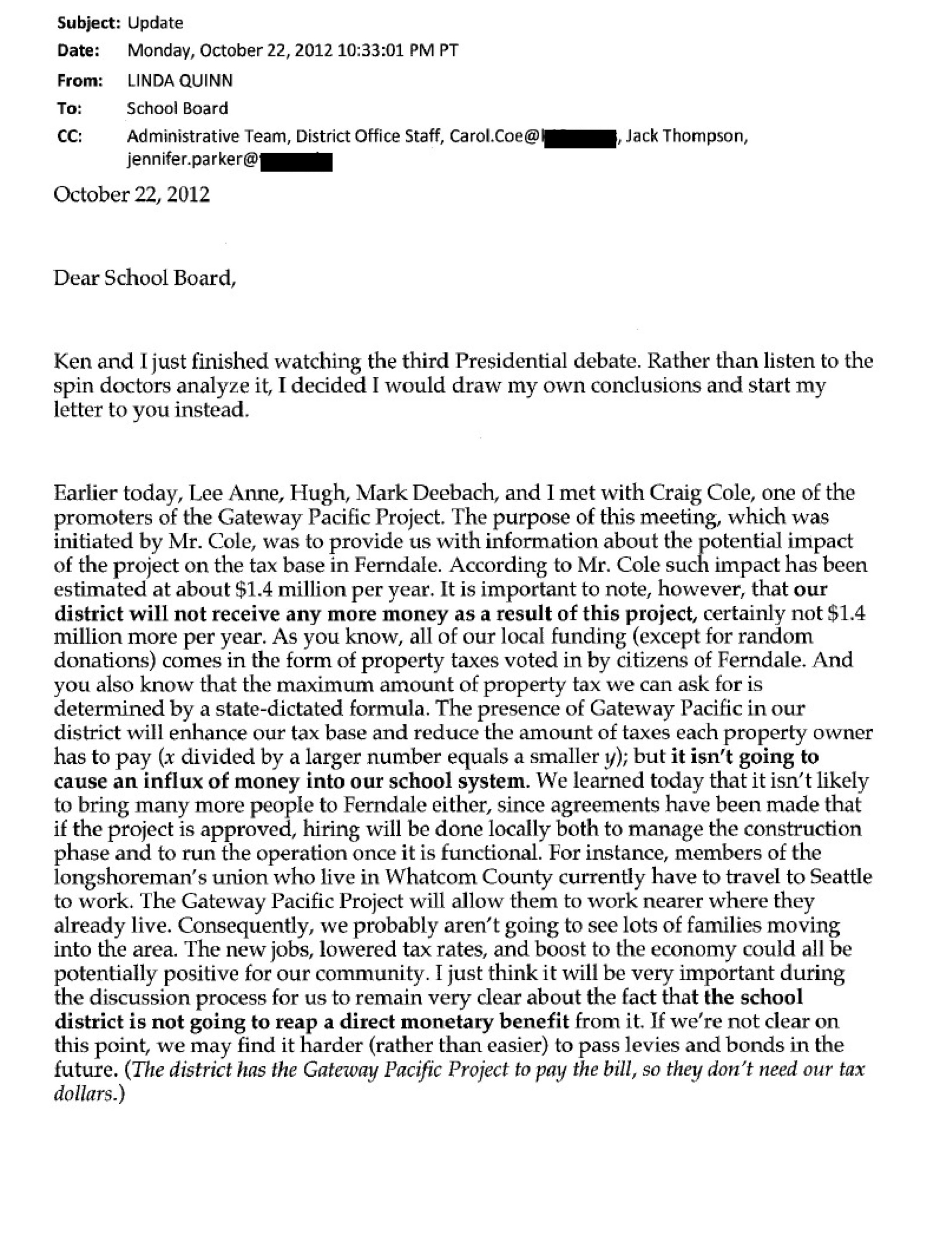 On October 22, 2012, during the Environmental Impact Statement (EIS) scoping period for Gateway Pacific Terminal, Ferndale School District Superintendent Linda Quinn sent an email to the Ferndale School Board summarizing a meeting she had earlier that day with SSA Marine’s public relations consultant for the GPT project, Craig Cole, along with three others who joined the meeting. (more…)